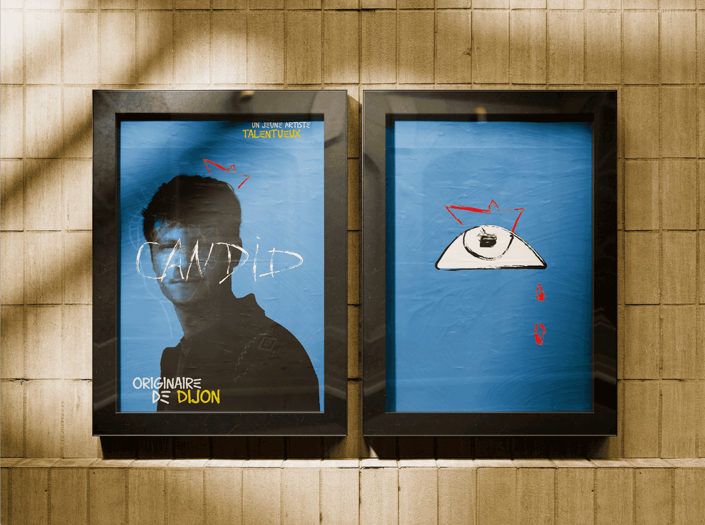 Supports de communication : Affiches, cartes de visite et bannières destinées à promouvoir CANDID et son premier projet sur différentes plateformes (Spotify, Instagram, etc.).