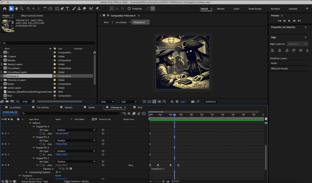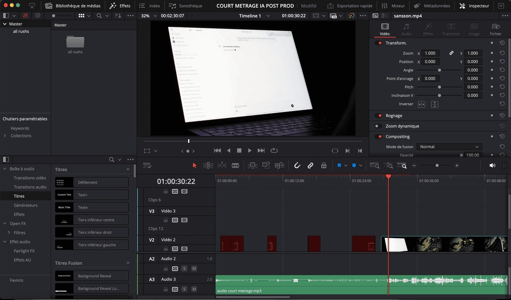 L’animation, réalisée avec After Effects, comprend des images générées par l’IA et une voix off également générée par l’IA, via un modèle de voix que j'ai moi même entrainé, pour accentuer la thématique centrale de l’influence de la technologie sur la créativité. Le montage a été réalisé sur DaVinci Resolve, tandis que la musique et les effets sonores ont été créés en post-production avec FL Studio, étant donné l’absence de microphone de qualité lors du tournage.